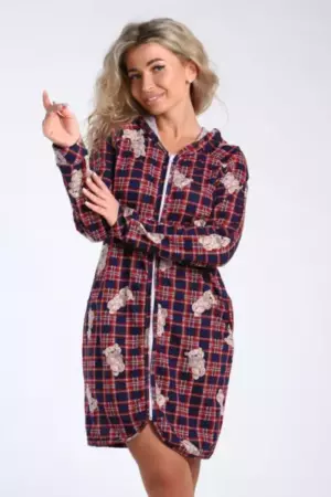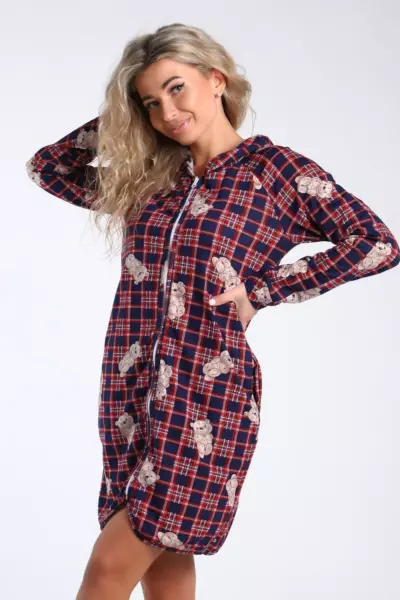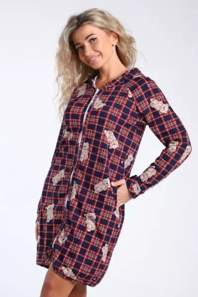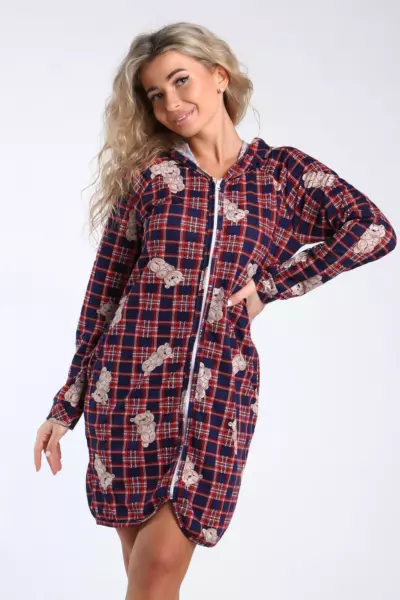 Халат на молнии с капюшоном и длинными рукавами - реглан. Карманы в боковых швах. Комфортен для повседневной носки.