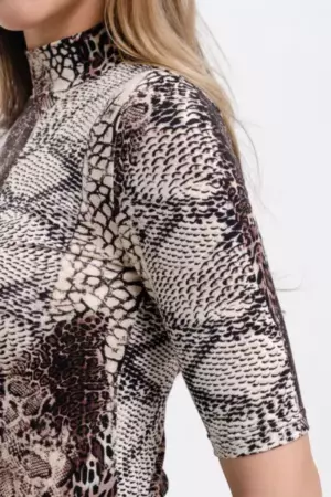 Водолазка с коротким рукавом станет базовым элементом вашего гардероба. Будет отлично сочетаться с юбкой, джинсами или брюками, можно надеть с пиджаком или курткой - выбирать вам. Модель выполнена из мягкой вискозы, ткань лёгкая в уходе, хорошо тянется, что придаёт комфорт в движении и удобство в использовании. Благодаря приталенному крою и эластичным свойствам ткани, наша водолазка облегает фигуру. Воротник-стойка имеет комфортную высоту и плотно прилегает к шее. Облегающий рукав до сгиба руки в локте добавляет стиль и комфорт. Принт, имитирующий змеиную кожу, не оставит вас равнодушной, универсальность этой расцветки позволяет сочетать её с разнообразной цветовой палитрой и элементами одежды.