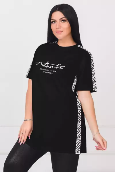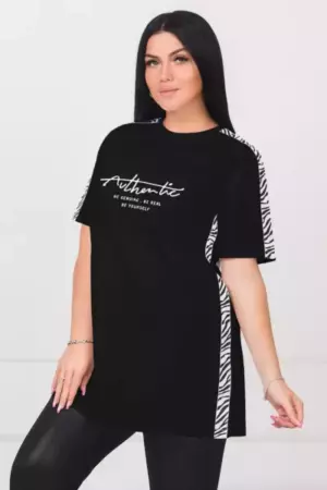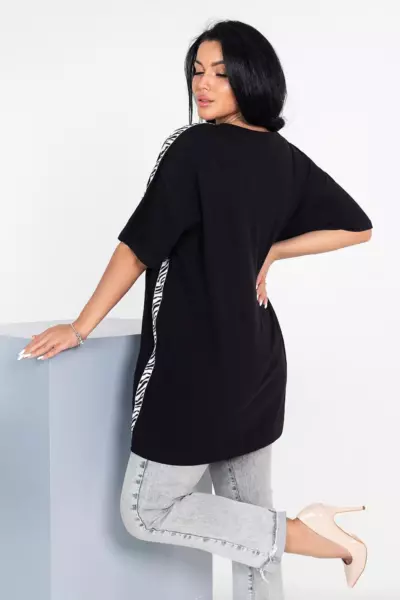 Туника свободного кроя, вырез круглый, рукав короткий, принт расположен на передней части туники. Футболка украшена декоративной тесьмой. Тесьма пришита по плечевому срезу и переходит на рукав, так же тесьмой украшены боковые швы.