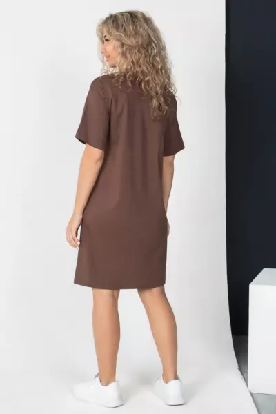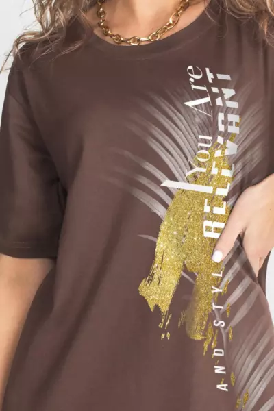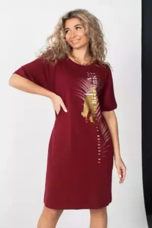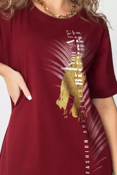 Туника женская длиной до колена, прямого силуэта, свободной формы. Рукав втачной, длиной до локтя. По середине переда выполнен дизайнерский принт.