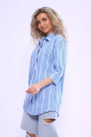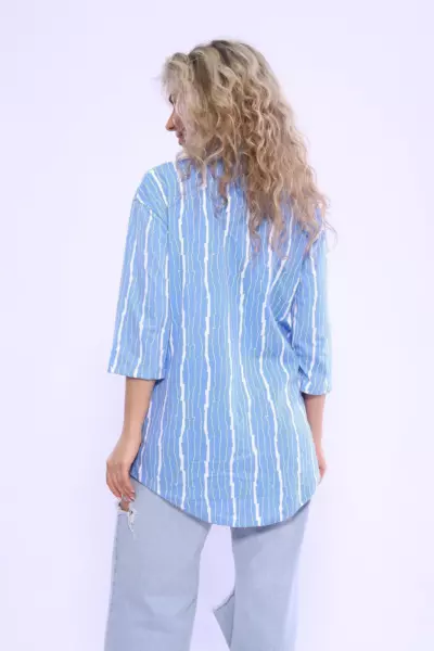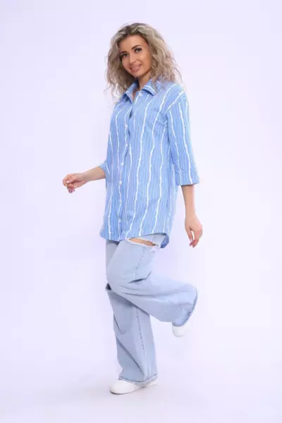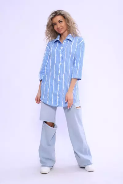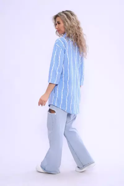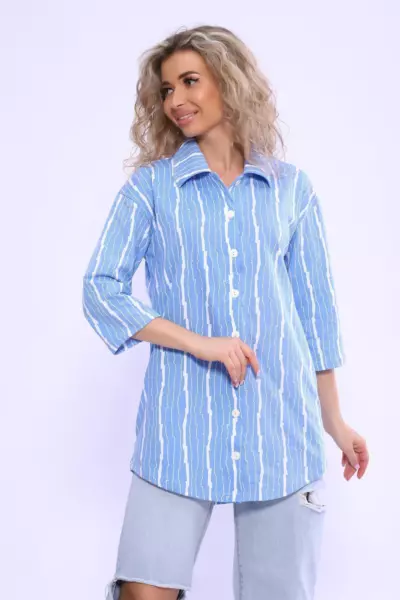 Туника полуприлегающего силуэта на пуговицах и рубашечным воротником. Рукава длиной 3/4. Карманы в боковых швах. Низ изделия полукруглый и слегка удлиненной спинкой.