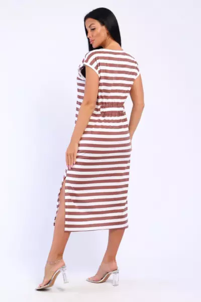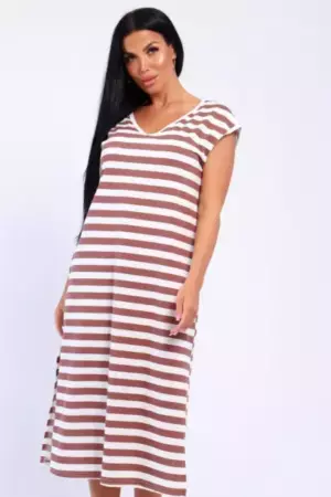 Женское платье из хлопкового гипоалергенного трикотажа. Модель свободного кроя, фигурный V- образный вырез горловины и спущенная пройма обработаны бейкой, в боковых швах удобные карманы, внизу высокие разрезы. Платье ,слегка присборенное на спинке, приталит и подчеркнёт вашу фигуру. Стильное, женственное миди- платье необходимая вещь в летнем гардеробе модницы любого возраста и фигуры. Оригинальное платье в полоску- это классика с изюминкой, популярная тема этого лета!