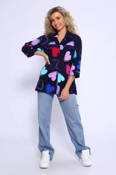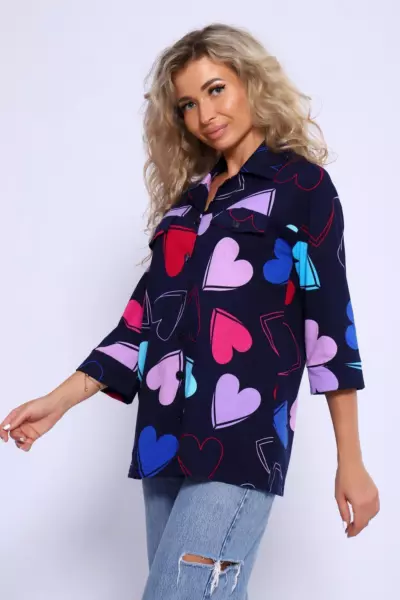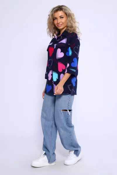 Туника свободного кроя, на пуговицах с рубашечным воротником. Рукава на манжетах длиной 3/4. Полочка с отрезной кокеткой и декоративными клапанами. В боковых швах небольшие разрезы.