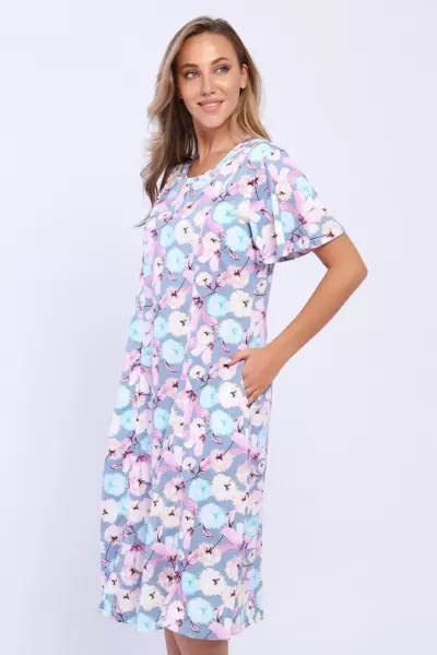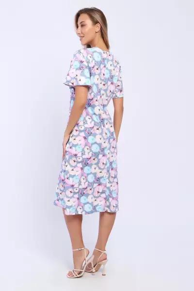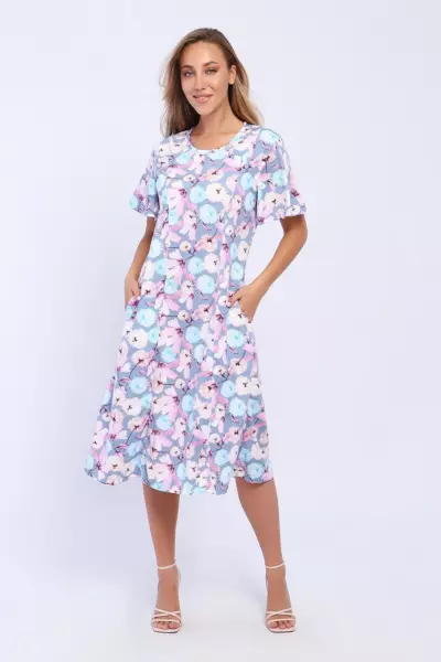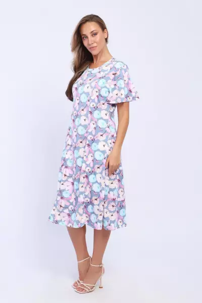 Платье полуприлегающего силуэта с короткими рукавами - крылышками. В боковых швах удобные карманы. Платье приталенное с разрезной спинкой и бочками на полочке.