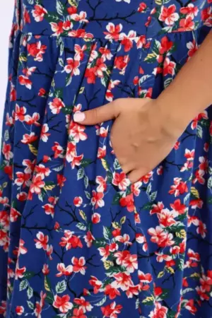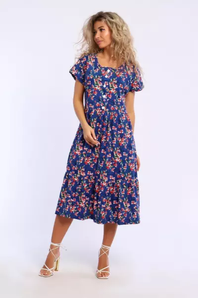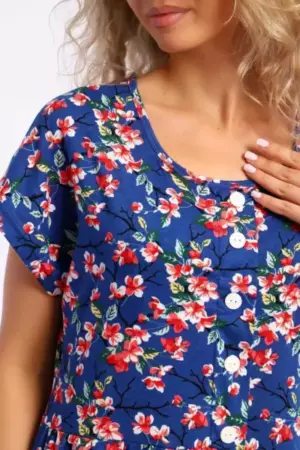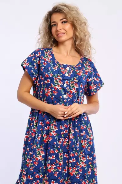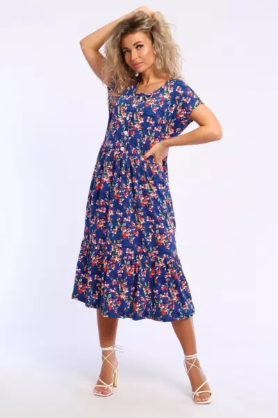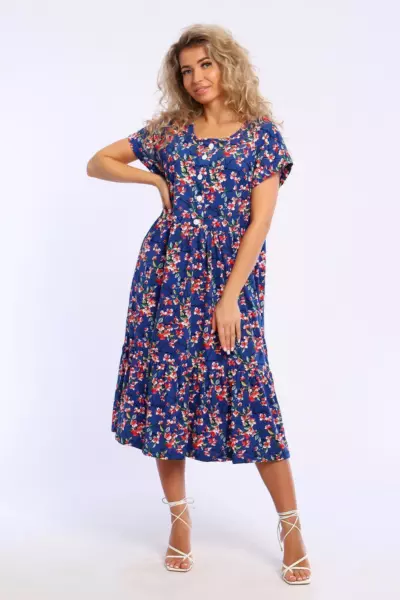 Платье с двумя воланами на сборке и спущенным плечом. На полочке имитация застежки на пуговицы.