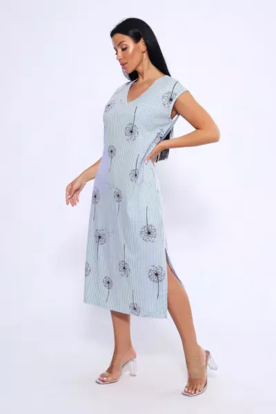 Платье женское из гипоаллергенного, хлопкового, высокого качества компакт пенье трикотажа. Модель слегка приталенного силуэта, фигурный V- образный вырез горловины, безрукавное, в боковых швах удобные карманы, внизу по бокам высокие разрезы. Принт в виде тонкой продольной полоски с изображением легкого, изящного соцветия одуванчика придаст стройности и женственности вашему образу. Летнее миди-платье комфортное, стильное, универсальное подходит для повседневных мероприятий, деловых встреч, а так же вечерних прогулок.