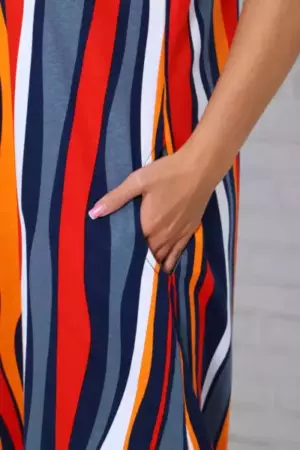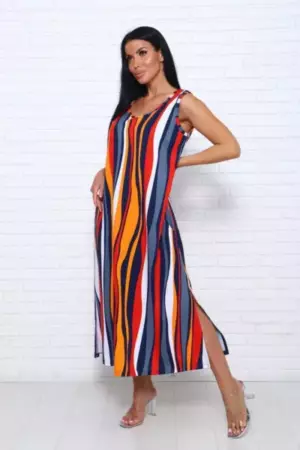 Сарафан женский выполнен из трикотажного полотна кулирка. Сарафан свободного силуэта, по бокам выполнены карманы, горловина и проймы окантованы.