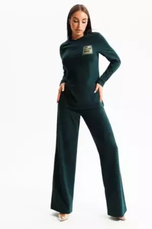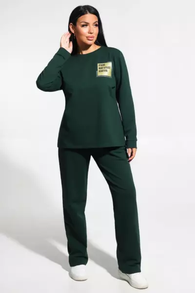 Костюм женский из футера 2 нитки, состоит из туники и брюк. Туника полуприлегающего силуэта, длиной до бедер, рукав втачной, длинный, с манжетой по низу. Горловина округлой формы с обтачкой. По переду нанесен дизайнерский принт. Брюки прямые, свободные, длинные. Притачной пояс на резинке, внутренние боковые карманы с наклонным входом.