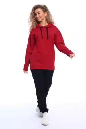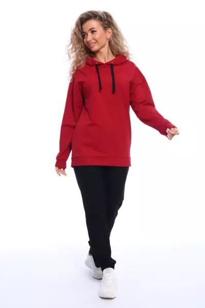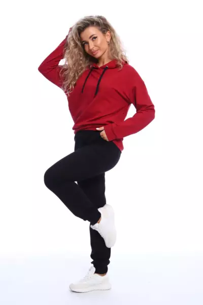 Костюм состоит из толстовки и брюк. Толстовка прямого кроя с капюшоном на завязках, рукава на манжетах. Брюки полуприлегающего силуэта с боковыми карманами, эластичным поясом на резинке и манжетами. Оригинальное сочетание рисунка толстовки и черных брюк.