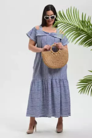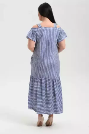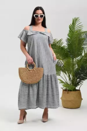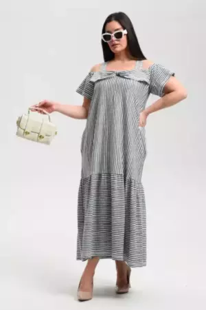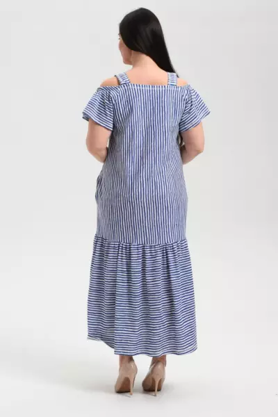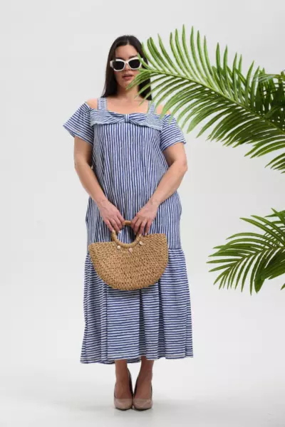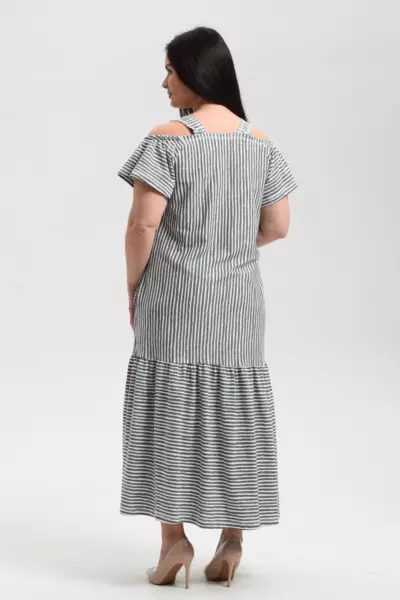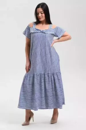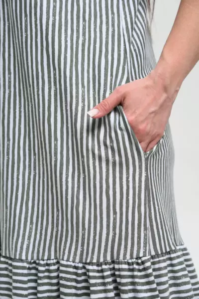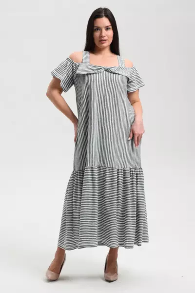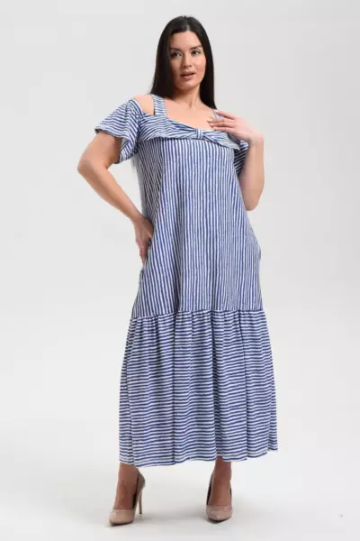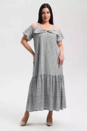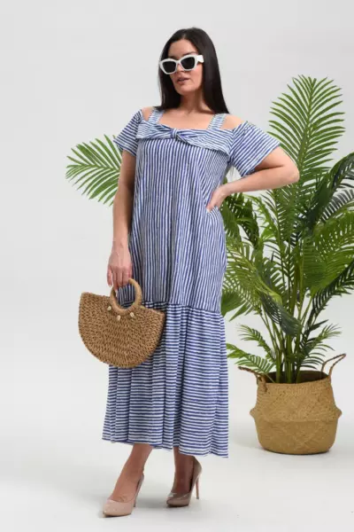 Сарафан женский "в полоску, с широкими бретелями, расширенный к низу. На верхних и нижних частях сарафана полоса в разных направлениях. На груди бант, в верхней части рукава небольшая сборка на резинку. В боковых швах внутренние карманы.