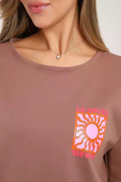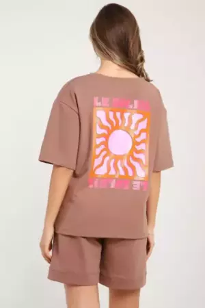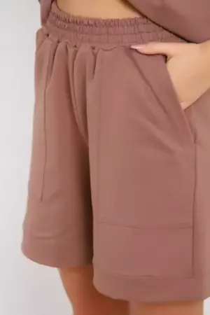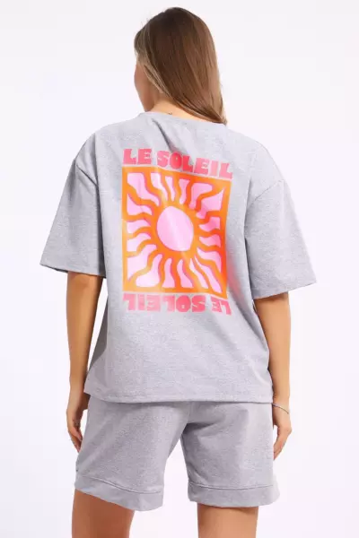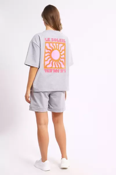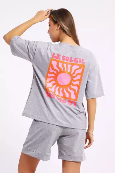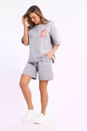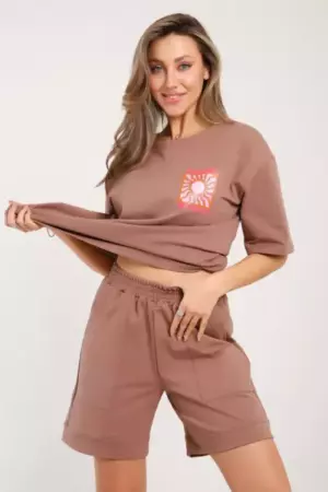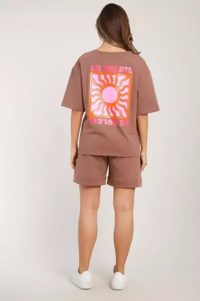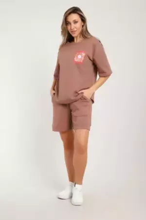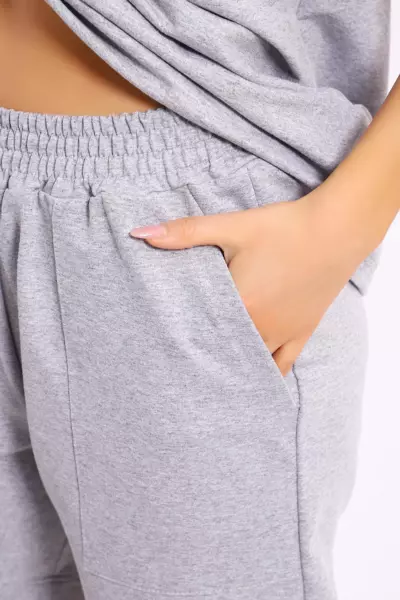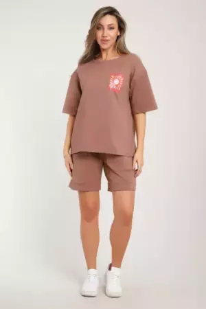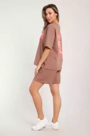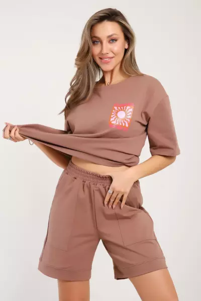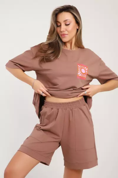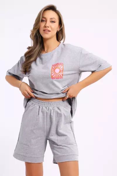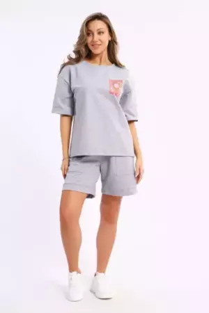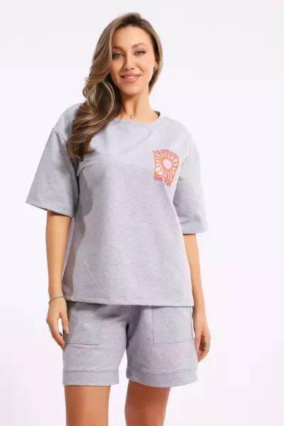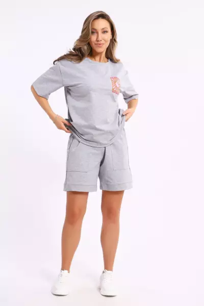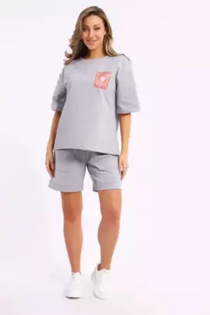 Костюм состоит из футболки и шорт. Футболка свободного кроя с короткими рукавами на спущенном плече. Шорты с накладными карманами и манжетами.