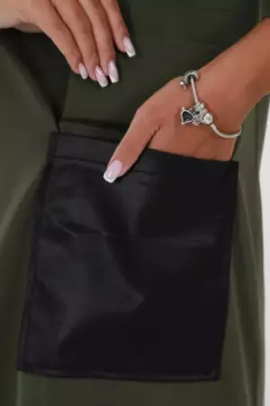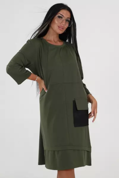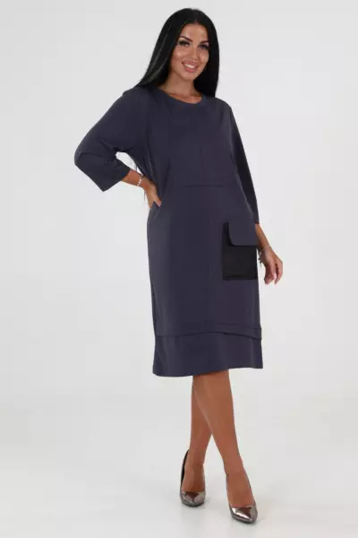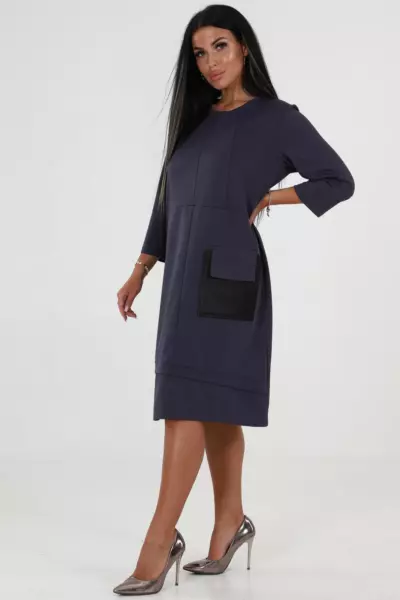 На полочке изделия расположен стильный накладной карман из отделочной ткани, который не только выполняет декоративную функцию, но и добавляет практичности вашему повседневному или праздничному наряду. Использование контрастного материала для кармана делает это платье особенно запоминающимся и визуально привлекательным.