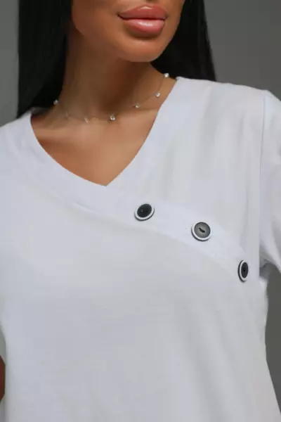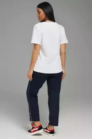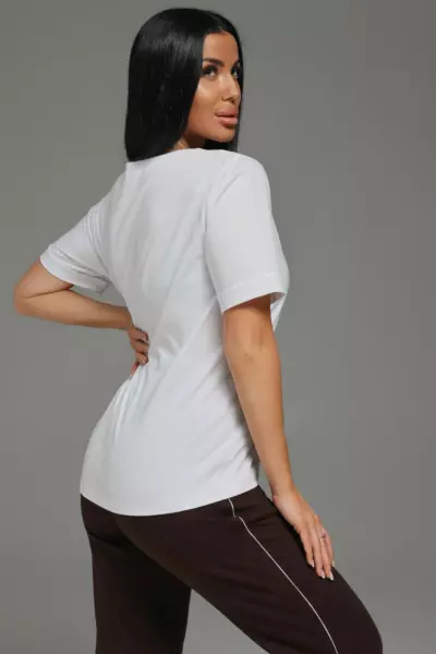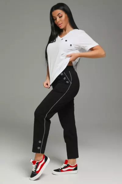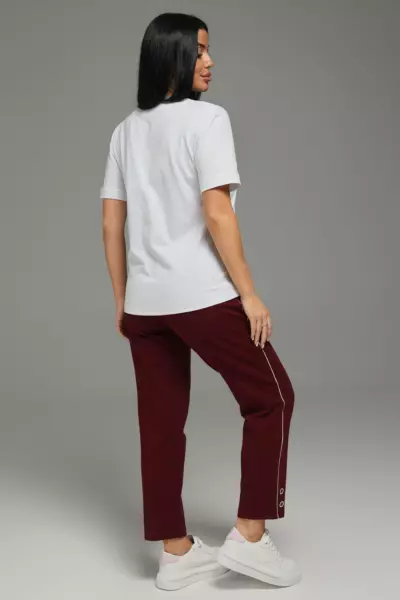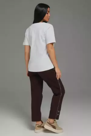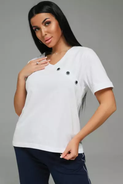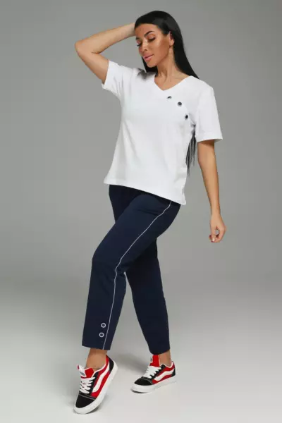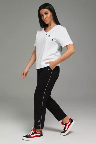 Брючный трикотажный костюм - это стильный и элегантный предмет гардероба, идеально подходит для дома и отдыха на любой период: весенний, осенний, летний и зимний. Костюм состоит из брюк и футболки, выполненный из высококачественного трикотажного материала. На карманах и по низу брюк декор дополнен декоративными пуговицами, как и на обтачке по фигурной планке. Изысканный комплект является идеальным выбором для всех, кто ценит качество и элегантность.
