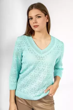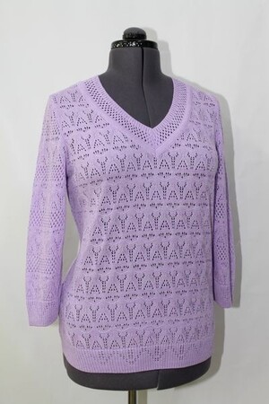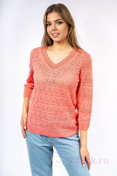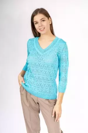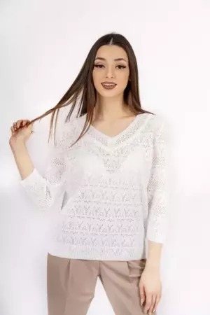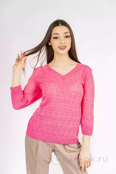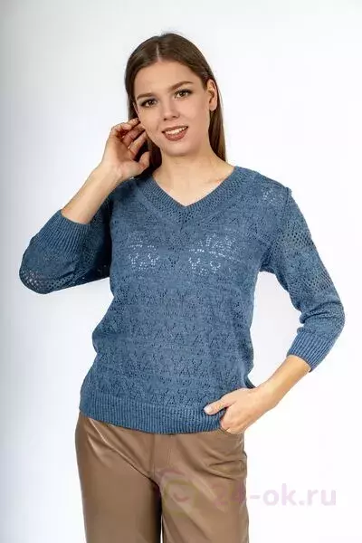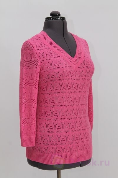 Джемпер женский ж0541. Джемпер полуприлегающего силуэта из ажурного вязаного полотна. Горловина на "мыс". Рукав втачной, укороченный. Низ изделия и низ рукава на "резинке". Состав: 50% Хлопок, 50% ПАН.