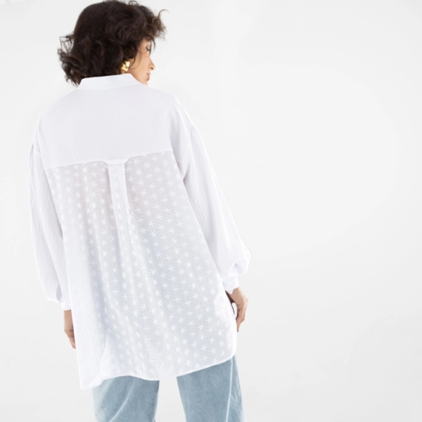 Эта изысканная рубашка из полупрозрачной ткани «Ценю внимание (new)» станет незаменимой частью вашего гардероба. Сочетание хлопкового материала с фактурой «поплин жатка» и «поплин вышивка» придает ей особую элегантность и универсальность. Независимо от того, ищете ли вы джинсовую рубашку женскую для повседневного образа или рубашку белую женскую для официальных мероприятий, эта модель идеально впишется в любой стиль. Благодаря свободному крою и легкому просвечиванию ткани, рубашка женская подчеркивает вашу утонченность и вкус, создавая изысканный образ.