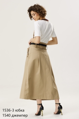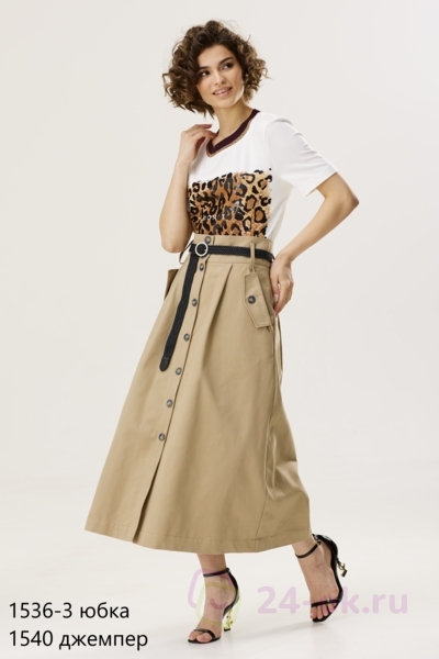 Женственная юбка силуэт трапеция длины миди. По переду заложены встречные складки. Имеются боковые карманы. Эта модель подчеркивает стройность фигуры и слегка приоткрывает ножку.
