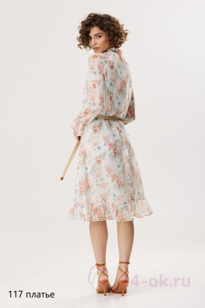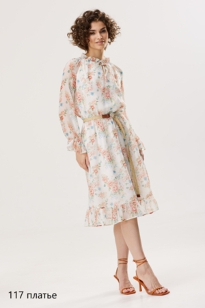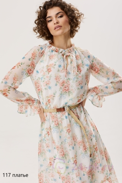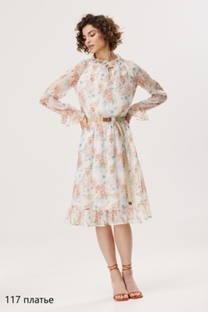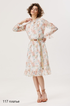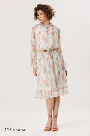 Изящное модное платье из итальянского шифона. Модель свободной формы, по линии талии вставлена резинка, расширенное к низу. Платье отрезное чуть выше линии талии с двумя ярусами воланов. Пояс в комплекте.