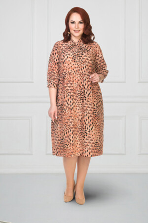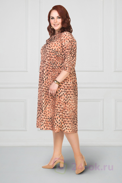 Эмилия – элегантное платье свободного силуэта из плательно-блузочной ткани с оригинальным принтом. Вырез горловины V-образный, украшен воротником, переходящим в бант. Рукава 3/4, втачные. По талии легкая сборка.