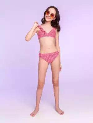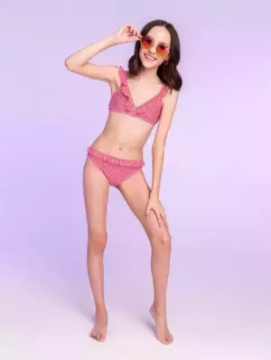 Яркий и оригинальный раздельный купальник для девочки, выполнен из качественного материала, который быстро сохнет, хорошо тянется и облегает по фигуре. Верх – топ на бретелях. Плавки классические комфортной посадки.