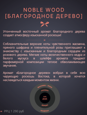 Аромат «Благородное дерево» вобрал в себя всю чарующую роскошь Востока, в которой хочется наслаждаться каждым моментом жизни.