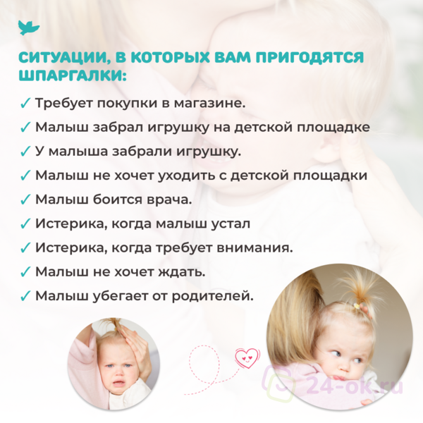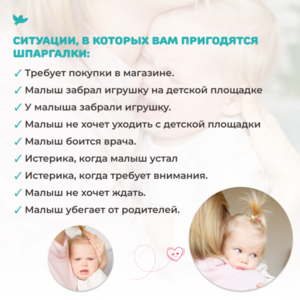 Они содержат советы психолога, как вести себя в разных сложных ситуациях, когда ребёнок капризничает: