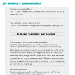 Вторая часть - это Дневник родителя. Он нужен, чтобы делать записи об эмоциях малыша и своих реакциях на его поведение. Это поможет понимать чувства ребёнка и спокойнее реагировать на его капризы.