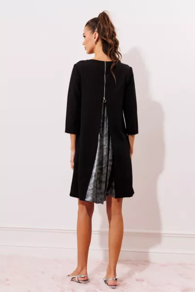 Платье А-силуэта с перфорацией в виде сердца по переду. По горловине застежка на навесную петлю-пуговицу. Рукав втачной одношовный с локтевой вытачкой. Спинка со вставкой из шифона с серебристым напылением с декоративной металлической тесьмой-молнией. Полочка платья на чехле из струящейся шифоновой ткани с серебристым контрастным напылением.