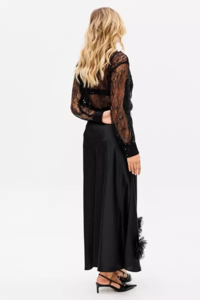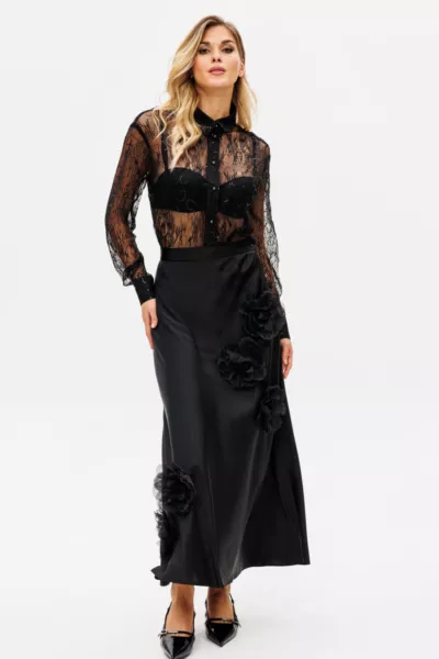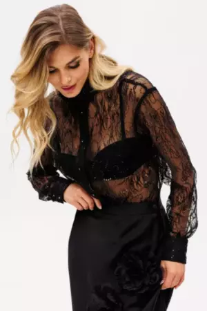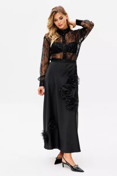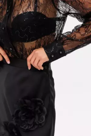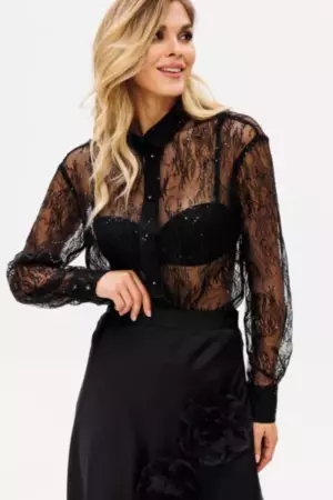 Блузка выполнена из гипюра с пайетками. Блузка прямого силуэта, длиной до линии бедер. Спереди застежка на пуговицы. Спинка цельная. Воротник стояче-отложной. Плечевой шов удлинен. Рукав втачной, одношовный со складкой и прорезью по низу. Низ рукава на притачной манжете, застегивающейся на две пуговицы.