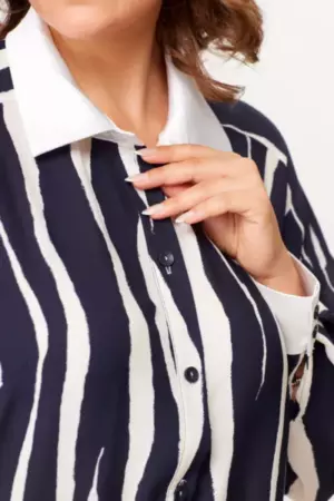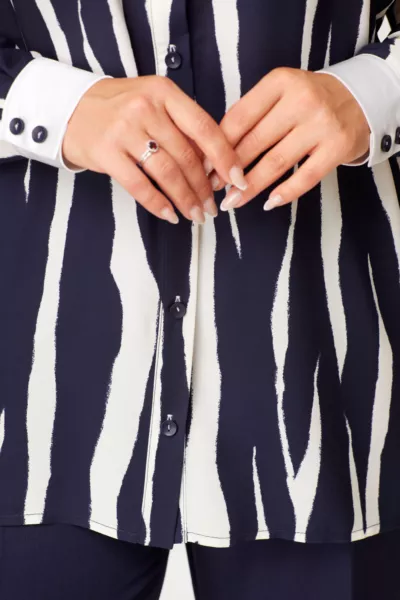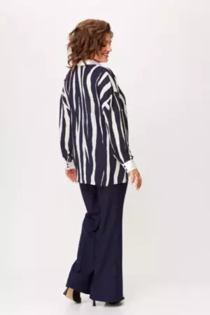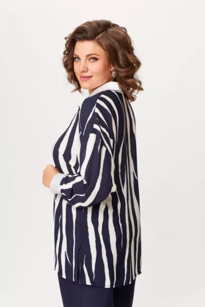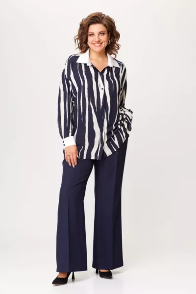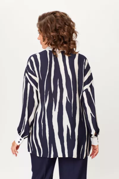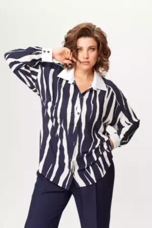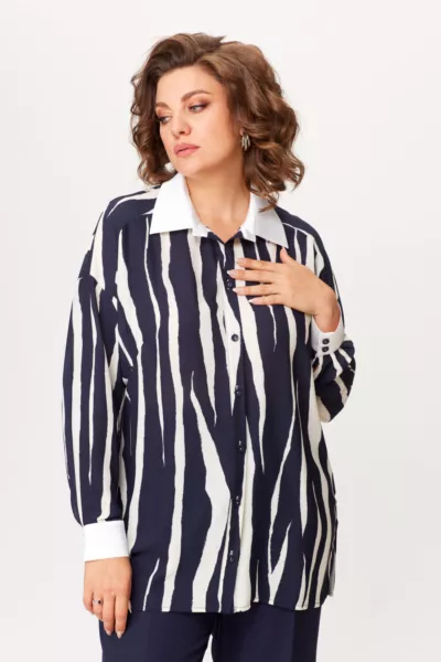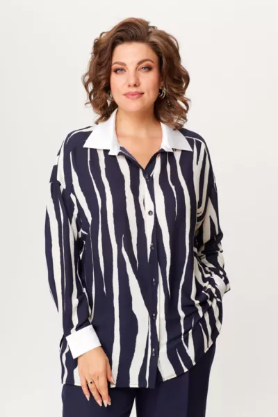 Блузка прямого силуэта выполнена из блузочного крепа с набивным рисунком. В качестве отделки использована однотонная ткань. Полочка блузки с нагрудными вытачками и центральной застежкой на петли и пуговицы по притачным планкам. Горловина круглой формы, обработана воротником рубашечного типа из отделочной ткани. Спинка цельная. Пройма углубленной формы, рукав одношовный, длинный, рубашечного типа. По низу рукав со складками на притачной манжете из отделочной ткани. Застежка по манжете на петли и пуговицы. В нижней части боковых швов обработаны разрезы.