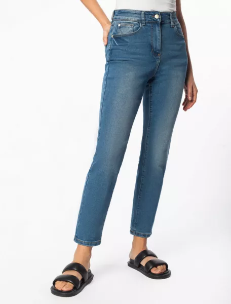 Джинсы mom-fit выполнены из эластичного денима. Лаконичная модель гармонично дополнит любой образ с рубашкой и жакетом, футболкой и лонгсливом. Изделие очень хорошо тянется и не ограничивает движения. На поясе брендированный патч.
