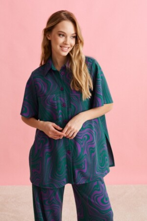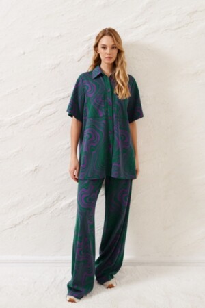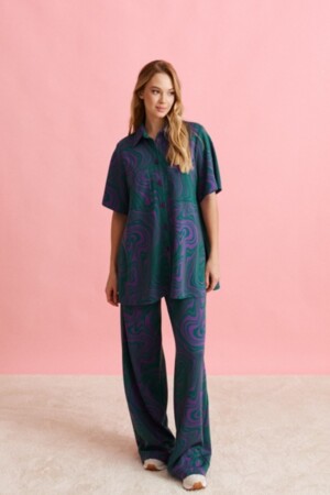 Комплект состоящий из рубашки и брюк выполнен из трикотажного полотна с абстрактным принтом - плавные линии.
