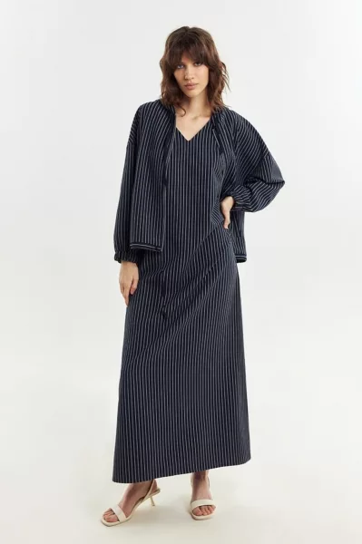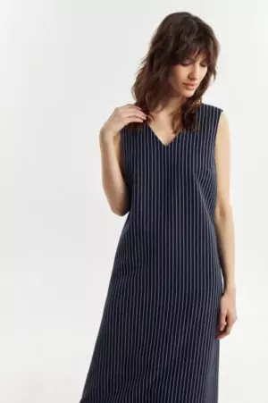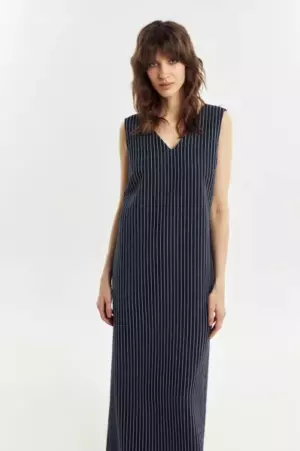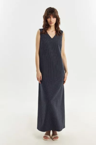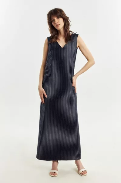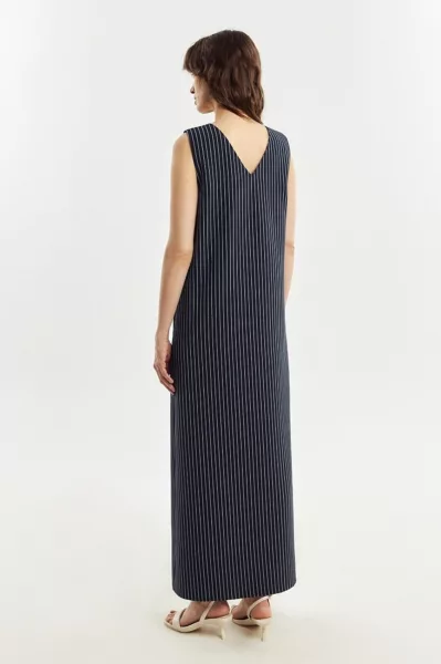 ID товара: 1094843, Состав: Полиэстер 71%; Вискоза 25%; Эластан 4%, Сезон: Весна/Лето, Длина: Длинная, Фасон: Прямой, Рукав: Без рукавов, Вырез горловины: V-образный, Рисунок: Полоски, Основная ткань: Полиэстер, Стиль: Повседневный, Страна бренда: Россия, Страна производства: Россия Прямое чуть расклешенное платье длиной макси из фактурной вискозной ткани в молочную полоску с V-образным вырезом на широких лямках и разрезами по боковым швам.