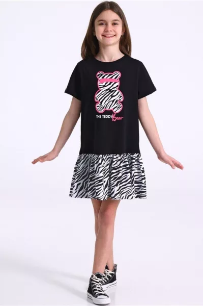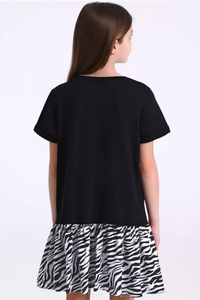 ID товара: 1099729, Состав: Хлопок 100%, Сезон: Весна/Лето, Длина: Короткая, Фасон: Свободный крой, Рукав: Короткий, Вырез горловины: Круглый, Рисунок: Анималистичный, Основная ткань: Хлопок, Стиль: Повседневный, Страна бренда: Россия, Страна производства: Россия Платье для девочки выполнено из кулира - легкого хлопкового полотна. Изделие трапециевидного силуэта, заниженная линия талии с присборенной юбочкой, короткие рукава со спущенной линией плеча и отворотами, украшено стильным принтом. Уход: только машинная стирка (руками не стирать!) при температуре 40 градусов, без предварительного замачивания. Изделия с печатью и декором перед стиркой необходимо вывернуть на изнаночную сторону. Тип ткани: кулир