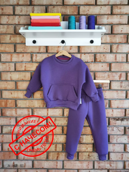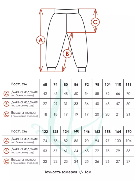 Брюки среднего объема, немного заужены к низу. Широкая резинка в поясе. Низ изделия обработан манжетами. Размеры от 140 и выше дополнены боковыми карманами.