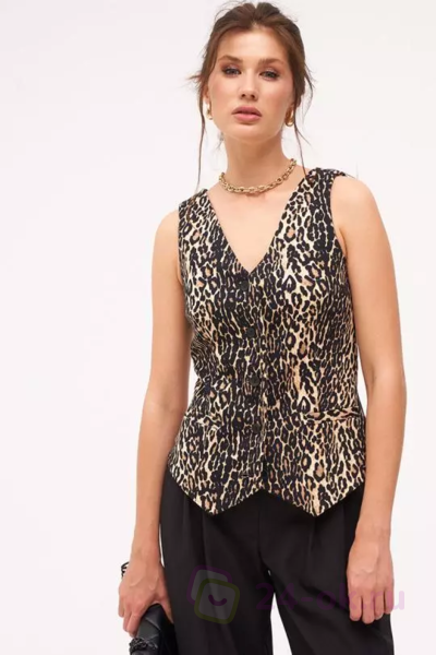 Жилетка женская умеренного объема полуприлегающего силуэта. Перед с талиевыми вытачками и имитацией карманов с листочкой. Спинка с талиевыми вытачками. Жилетка на притачной подкладке. Застежка центральная, на прорезные петли и пуговицы.
