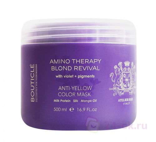 Восстанавливающая маска с фиолетово-синими пигментами разработана специально для поддержания холодных оттенков блонд, эффективной нейтрализации проявляющихся нежелательных желто-оранжевых тонов и придания благородного серебристого оттенка седым волосам. Входящие в состав молочные протеины и гидролизованные протеины шелка восстанавливают структуру обесцвеченных и осветленных волос, поддерживают необходимый уровень увлажненности, возвращают волосам прочность и эластичность. Масло манго, благодаря комплексу витаминов и высокому содержанию жирных кислот, обеспечивает защиту от негативных факторов окружающей среды. Нанесите на чистые, влажные, отжатые полотенцем волосы, равномерно распределите по всей длине мягкими массирующими движениями, оставьте для воздействия на 3-5 минут. Смойте. Частота применения 1-2 раза в неделю. Для максимального эффекта используйте с Anti-Yellow Shampoo. Рекомендована для осветленных, обесцвеченных и натуральных волос, подвергшихся выгоранию на солнце, с целью нейтрализации фона осветления и придания холодного оттенка. Бренд: Bouticle; Линия: Blond care; Тип средства: Маска; Назначение: Устранение желтизны, для блондинок