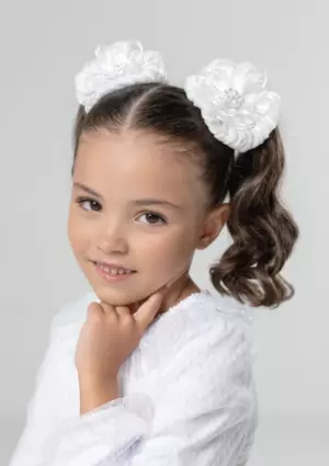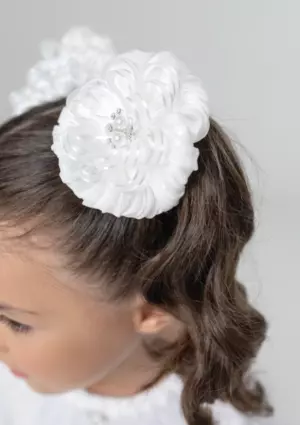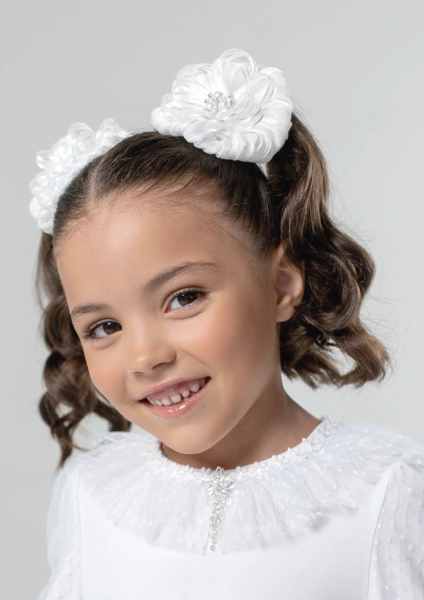 Очаровательный бант для девочек из органзы. Верх украшен лентой и брошью со стразами и жемчугом. Диаметр 9 см.