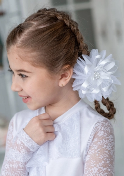 Объемный нарядный бант для девочек, выполнен из капрона, декорирован атласной лентой, середина украшена жемчужиной со стразами, отлично дополнит школьную прическу. Диаметр 14 см.