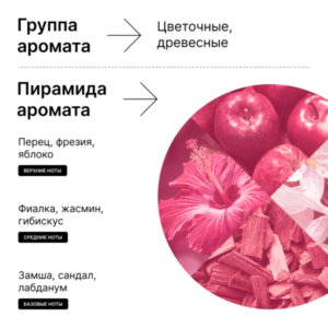 Аромат стремится к чувственности, граничащей с соблазном. Ода женской энергии в первозданном виде. Композиция раскрывается ямайским перцем и пурпурной фрезией. В сердце царит иранский жасмин, болгарская роза и гибискус. В конце вы услышите ноты замши, сандала и ладана.