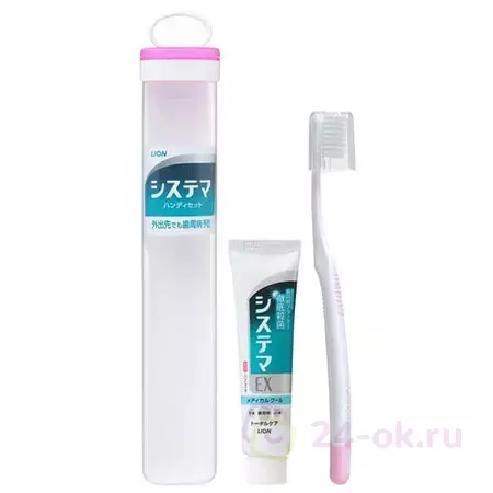 В набор входят: лечебная зубная паста “Dentor Systema EX”, компактная зубная щётка с ультратонкой щетиной около 0,02 мм.