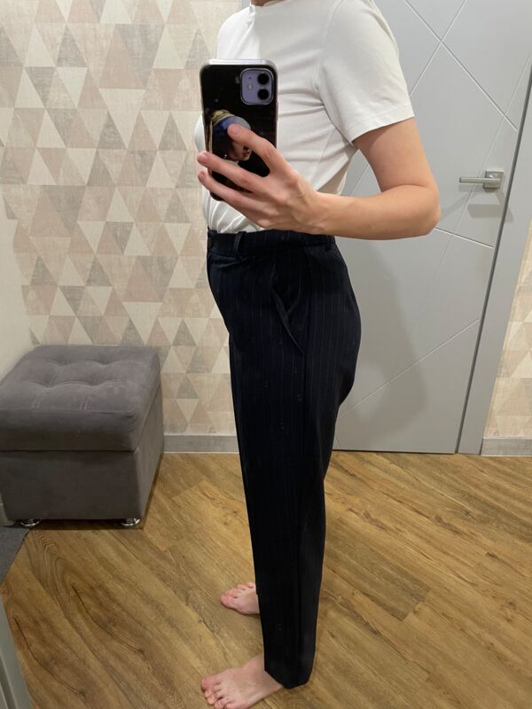 Брюки прямого кроя выполнены из костюмной ткани глубокого синего цвета, с вертикальными полосками. Брюки на стабильном поясе, по поясу нашиты шлевки, застежка пуговица и молния, по передней и задней части изделия заутюженные стрелки, в боковых швах карманы.