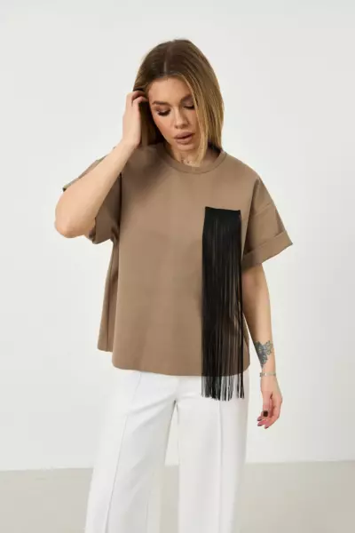 | Джемпер из трикотажной ткани в бежевом цвете. Линия плеча спущена, рукав короткий с подгибкой. Декоративный элемент по переду, по левой стороне изделия Состав: вискоза 60%, нейлон 35%, спандекс 5% |