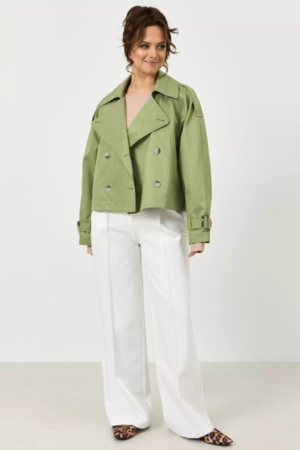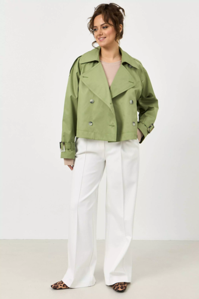 Укороченный тренч из плащевой ткани. По переду застежка на пуговицы. Спущенная линия плеча, по низу рукава манжета с патой. Состав:ПЭ 100%