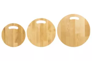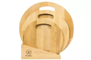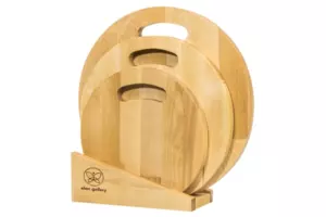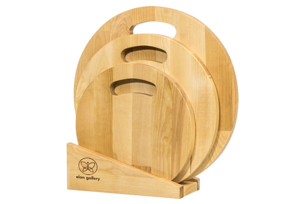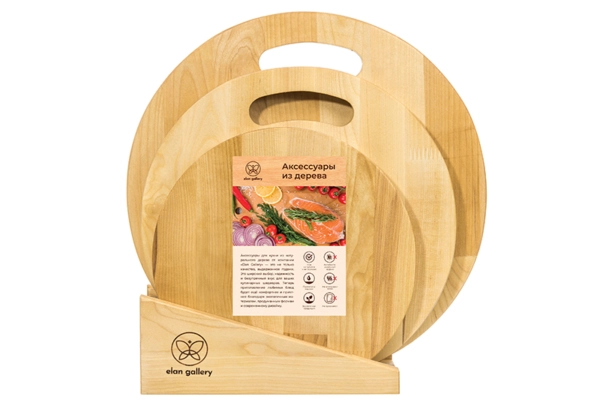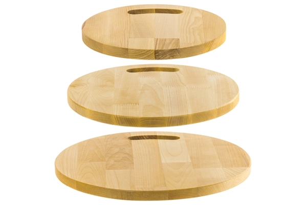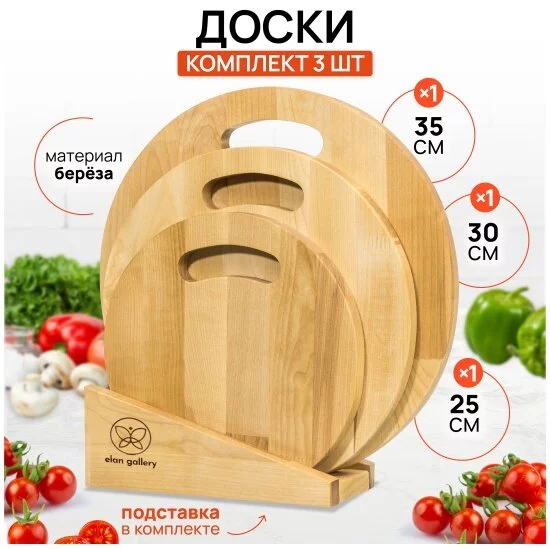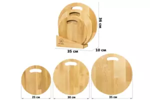 Набор состоит из трех разделочных досок и подставки. Круглые доски выполнены из березы и различаются по размеру: 35х35х1,8 см, 30х30х1,8 см и 25х25х1,8 см. Такой набор станет не только надежным помощником в резке продуктов, но и стильным украшением кухни. Доски имеют отверстия для подвешивания, что позволит при необходимости хранить доски по отдельности. Доски подходят для красивой сервировки пиццы, жареного мяса, овощей и прочих блюд. Доски уже пропитаны маслом. После каждого использования протирать влажной губкой. Не замачивать в воде. После мытья под струей воды протереть насухо. Не сушить около отопительных приборов и рядом с плитой. Хранить вертикально или в подвешенном состоянии в помещении с нормальным уровнем влажности. Не использовать в качестве подставки под горячее. Не мыть химическими средствами или в посудомоечной машине. Рекомендуется не реже одного раза в месяц обрабатывать все стороны растительным маслом. Так доска прослужит долго и будет радовать красотой и функциональностью!