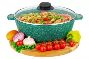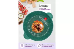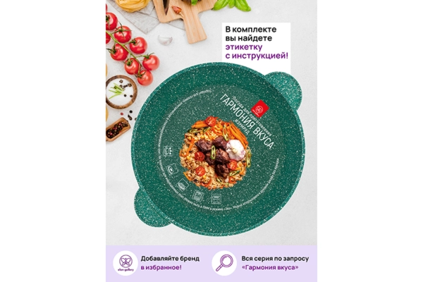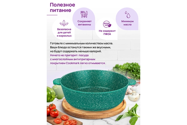 Жаровня «Изумруд» из серии «Гармония вкуса» предназначена для приготовления горячих блюд. Размер изделия – 32,5х27х14,5, объём – 3,7 литра. Высота без крышки – 9 см, высота внутренней части – 8,4 см, диаметр дна – 20 см. Сотейник изготовлен из толстостенного алюминия и имеет ультрапрочное двухслойное антипригарное покрытие Cookmark. Оно устойчиво к износу и царапинам, не содержит PFOA и других вредных веществ, что делает его полностью безопасным для здоровья. Толстые стенки и плотно прилегающая крышка из жаропрочного стекла создают при нагреве эффект духовки. Пароотвод обеспечивает равномерную циркуляцию. Жар распределяется по изделию таким образом, что продукты надолго сохраняют свои сочность, аромат и полезные свойства. Красивая алюминиевая жаровня – мечта любой хозяйки. С её помощью вы легко приготовите вкусную пищу дома и на даче. Используйте глубокий сотейник для приготовления мясных, рыбных и овощных блюд. Это универсальная кухонная утварь, подходящая для варки, жарки и тушения. Приготовьте в ней плов, бульон или самые разнообразные угощения из мяса, рыбы и овощей. Правила эксплуатации: не нагревайте без продуктов. Прежде, чем поместить в воду, дайте изделию остыть. Пользуйтесь только деревянными и силиконовыми приборами. Не мойте абразивными или щелочными моющими средствами. Использование в посудомоечной машине допускается только в режиме «Эко» с применением средств, не содержащих щёлочь. Подходит для газовых, электрических и стеклокерамических плит. Не подходит для индукции. Без крышки подходит для запекания в духовом шкафу при температуре до 230 градусов. Такая посуда станет прекрасным подарком маме или бабушке. В серии «Гармония вкуса» вы найдёте сковороды, кастрюли, блинницы, казаны и жаровни. Соберите набор для вашей кухни в едином стиле и дополните свой инвентарь!