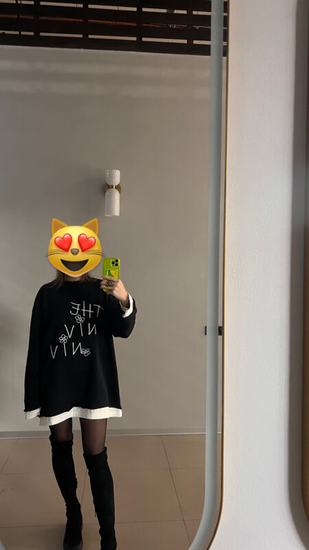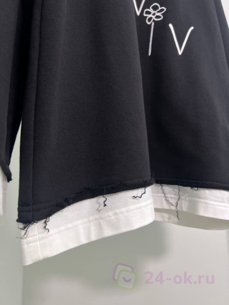 Удлиненный свитшот свободного силуэта - "Oversize", выполнен из плотного премиального трикотажного полотна. Спущенная линия плеча. Рукав длинный, расширенный книзу. Спина прямая. Горловина круглая, с притачной планкой, выполненной из отделочной ткани (довяз). По низу изделия и по низу рукава - вставка, выполнена из отделочной трикотажной ткани. На передней половинке авторская вышивка “THE NIV NIV”