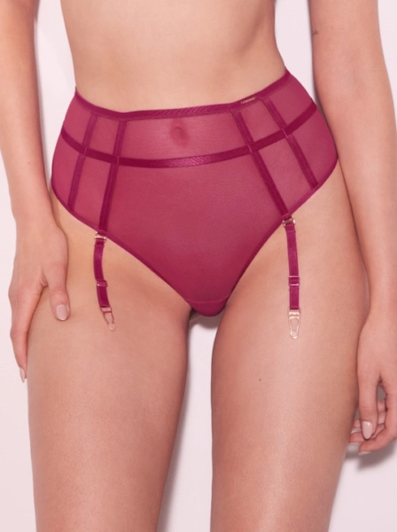 Трусики стринг-пояс из коллекции Sono с завышенной талией выполнены в цвете фуксия из эластичной сетки, декорированы тонкими эластичными резинками. Пажи для чулок съемные, регулируются по длине, фурнитура металлическая цвета меди. Ластовица из 100% хлопка. Идеально сочетаются с бюстгальтерами Sono._x000D__x000D_Бренд: AllesСостав: полиамид 85%, эластан 8%, хлопок 7%