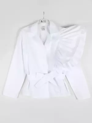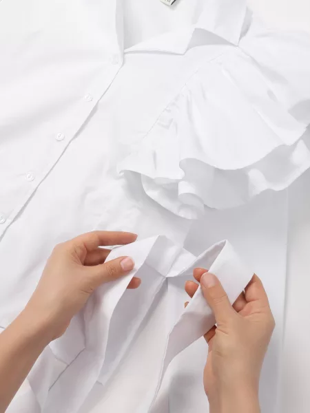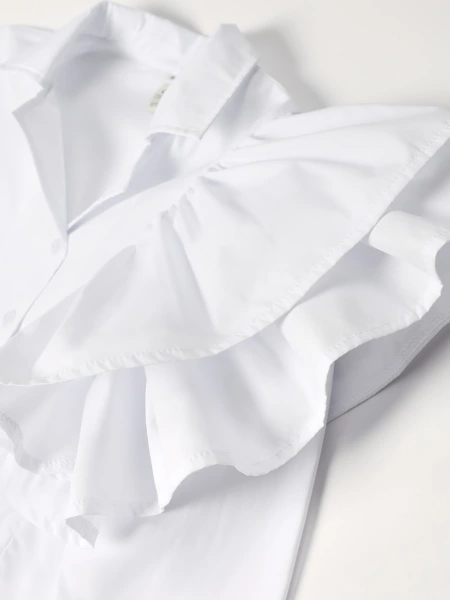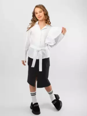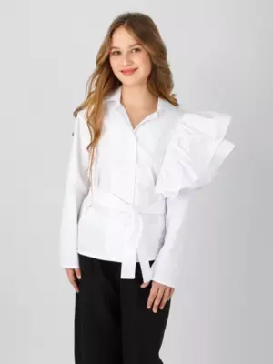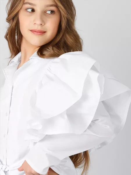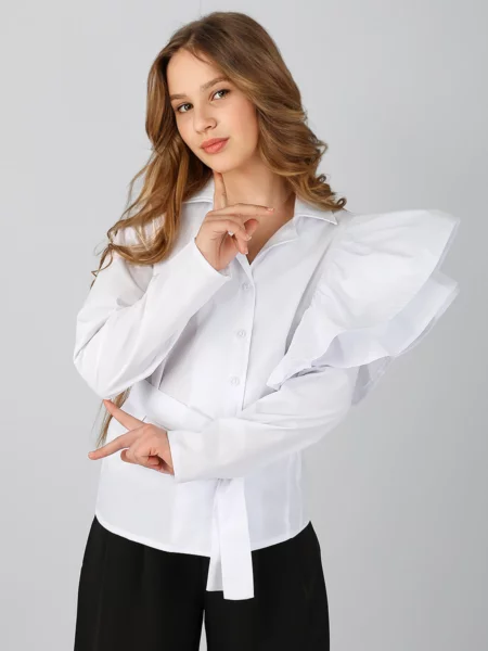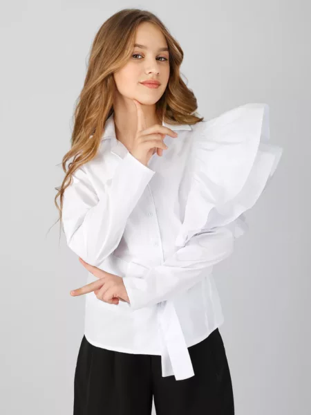 Блузка для девочки Соль&Перец, на пуговицах, из натурального хлопка, с отложным воротником. Особенностью блузки являются пышные воланы и пришитый пояс выполненные из основной ткани, которые добавляют ей изящества и уникальности. Блузка прекрасно сочетается с брюками или с юбкой, подчеркнёт индивидуальный стиль девочки, и разнообразит её повседневный школьный образ.