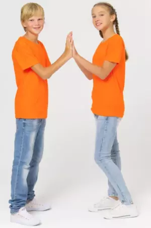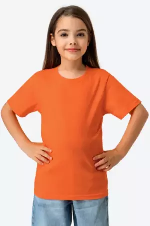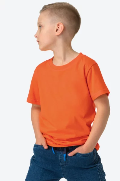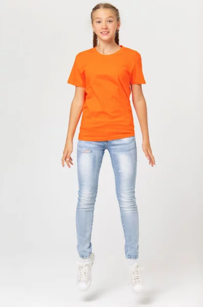 Универсальная классическая футболка для девочек и мальчиков подойдет на каждый день! Детская футболка оранжевого цвета выполнена из 100% хлопка.