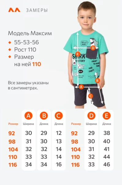 Модель Максим, рост 110 см, параметры 55-53-56. На нем размер 110.